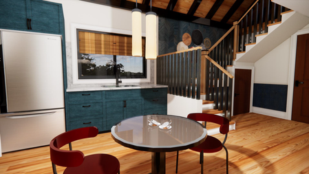 Nestled in Muskoka, Ontario, this cottage embodies rustic charm with timeless elegance. Warm reds, calming blues, and sunny yellows blend seamlessly with nature. Inside, the living room's cozy setup centers around a grand stone fireplace, creating texture and a focal point. The vintage kitchen combines style with functionality, while upstairs, a loft office boasts serene lake views. The bedroom offers rustic tranquility, and the bathroom features charming details for a rejuvenating retreat. Together, these elements create a cozy haven that embraces Muskoka's beauty in perfect harmony.